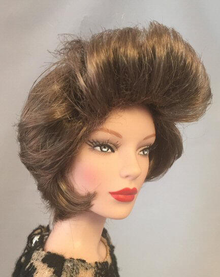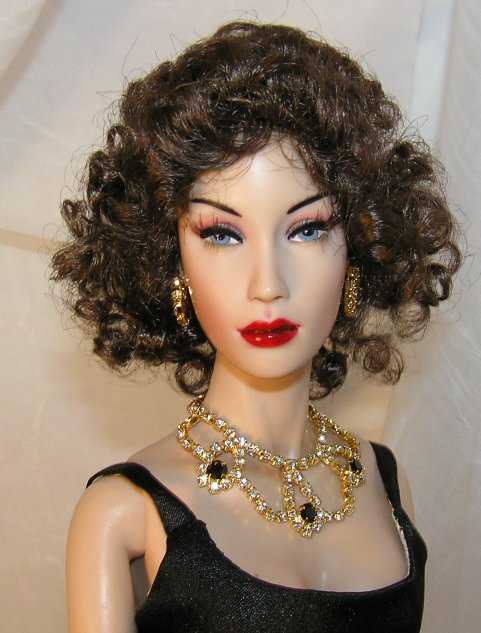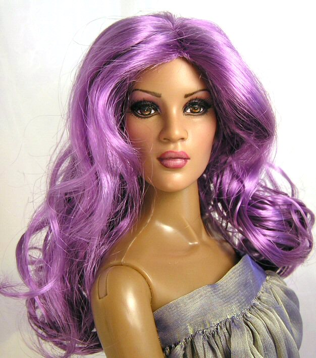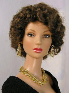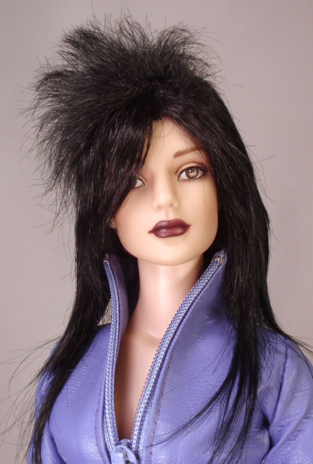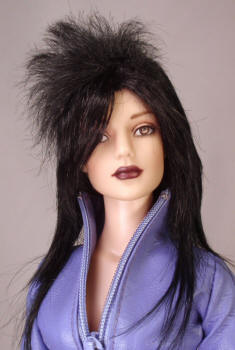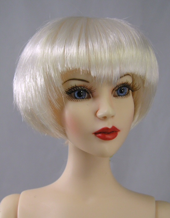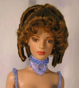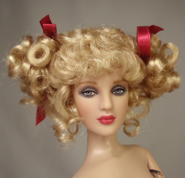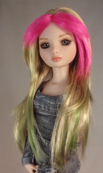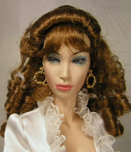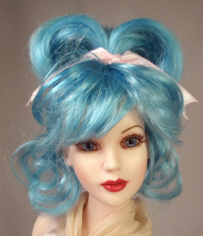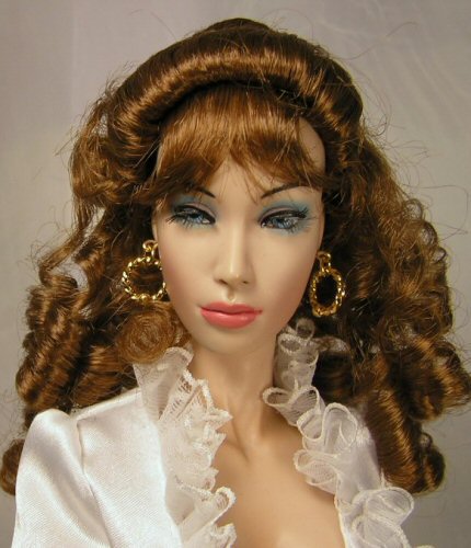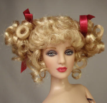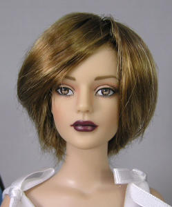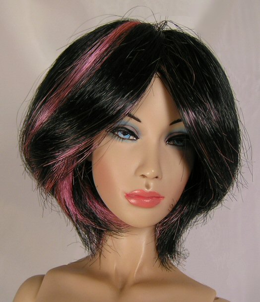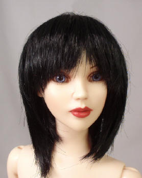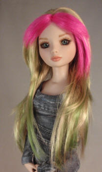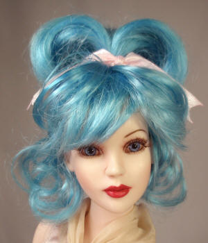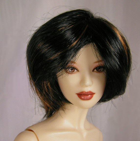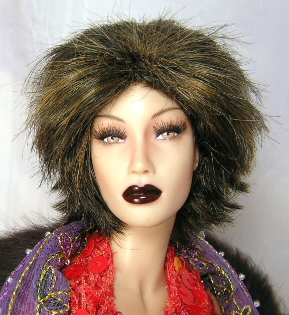 Most of the following "fun" colors are not a blend. They are black/brown combination with a small streak of color on one or both sides of the front. Both wigs to the left are the Black/Brown/Gold, but the size 5/6 has highlights on both sides. The other colored wigs only have a streak, like on the Goodreau Innuendo doll shown. The ones that I have in stock (bold) are on clearance for $15. Others can be ordered.