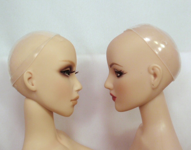 Silicone Wig Caps on Sybarite and Antoinette These stretchy clear silicone wig caps give an ideal non-slip surface and help with wig fit. They are sized to sit on the pate of the head, but can be trimmed if needed. These are really terrific! Try it for one doll and you'll want one for all of them! |
