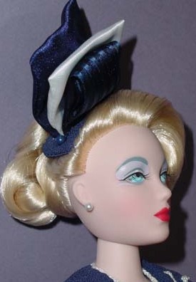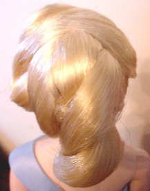 - Medium blonde doll with hair in elaborate twist and sweep near left eye
