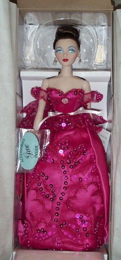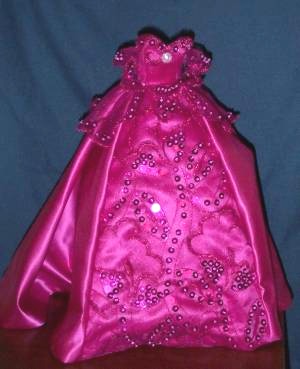- Fuchsia taffeta gown with front panel of sequined organza. Fuchsia