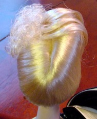 Light blonde Madra with upswept hair and curls on side of forehead. Rolled under on both sides of head in back.
