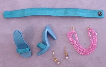 - strapless aqua blue satin flared evening gown with hot pink trim and rhinestone pin at bustline