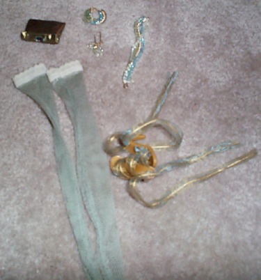 - gold soles with sheer olive green & gold ribbon ties