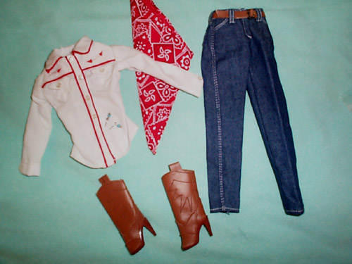 Tooled" (actually topstitched) brown vinyl boots, to match the color of the belt. brown high heeled bases