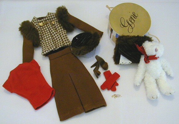 - Houndstooth jacket with brown crepe sleeves, brown faux fur at shoulders and