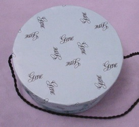 Aqua circular hat box with all-over Gene logo. Black twisted cord. Early ones have a silver sticker on the bottom which say "First Edition. Produced from 1995 through 1997.