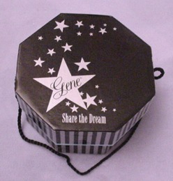 Black and silver octagonal hatbox striped sides and stars with Gene log on top. Black twisted cord. Produced in 2000.