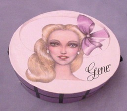 Oval hatbox with lavender and black striped sides and Mel Odom portrait of blonde Gene with logo on top. Black twisted cord. Produced in 2001.