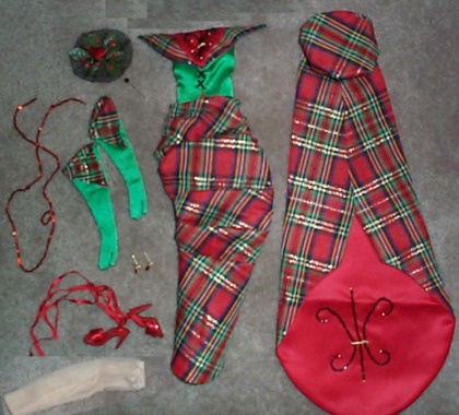 - Detachable train of plaid cotton, cut like a man's tie on the bias and faced with red satin.