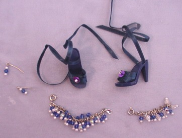 - dark blue ribbon tie shoes with pearl and sequin on toes.