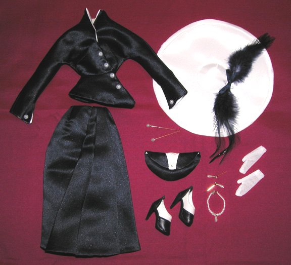 - large white satin portrait hat with navy feathers