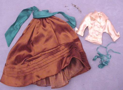 - Copper satin skirt with attached light teal sash (ties in back) and