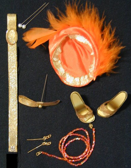 - Satin orange straight gown, split up to the knee, with peplum and gold