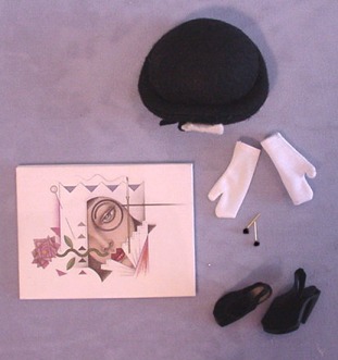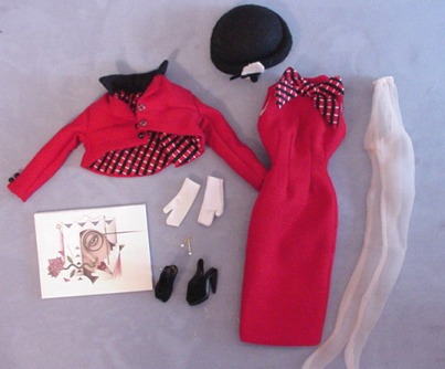 - Red suit dress with big black/white & red plaid bow at neckline.