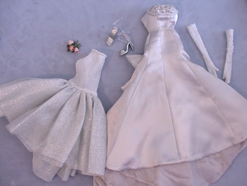 - platinum satin flared ballgown with 3 tiered bell shaped cascading train,