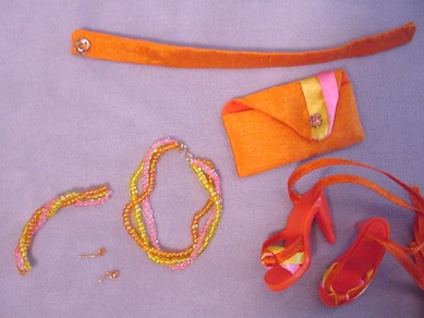 - orange dress w/pink and yellow over the shoulder sash