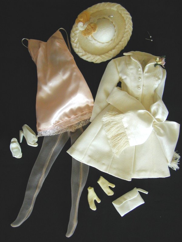 - off-white coatdress with pink/yellow fabric flowers at lapel and wide fringed attached sash.